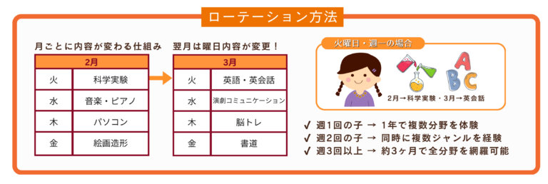 毎月、曜日ごとにランダムで体験内容が変わる、多分野ローテーション型プログラムです。