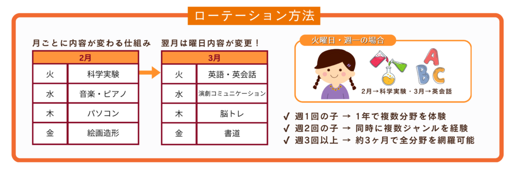 毎月、曜日ごとにランダムで体験内容が変わる、多分野ローテーション型プログラムです。