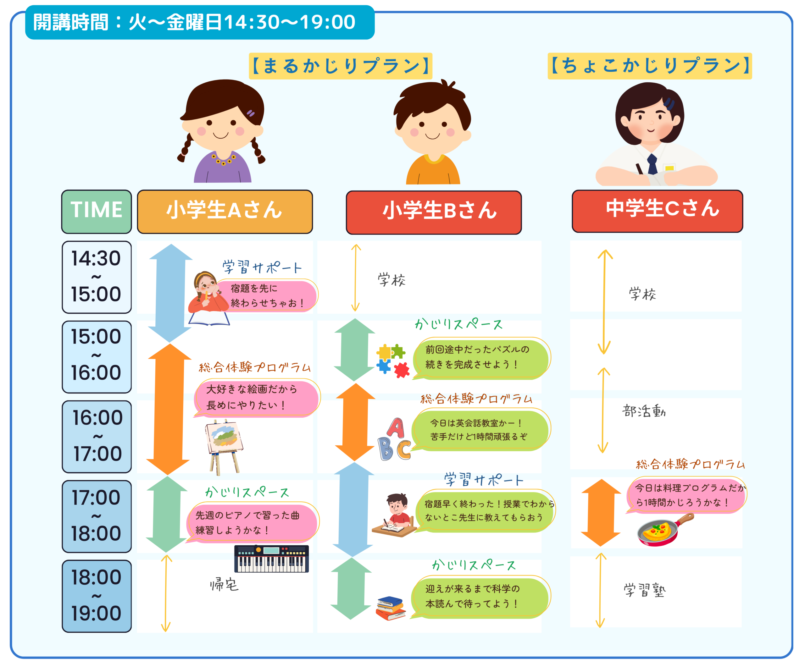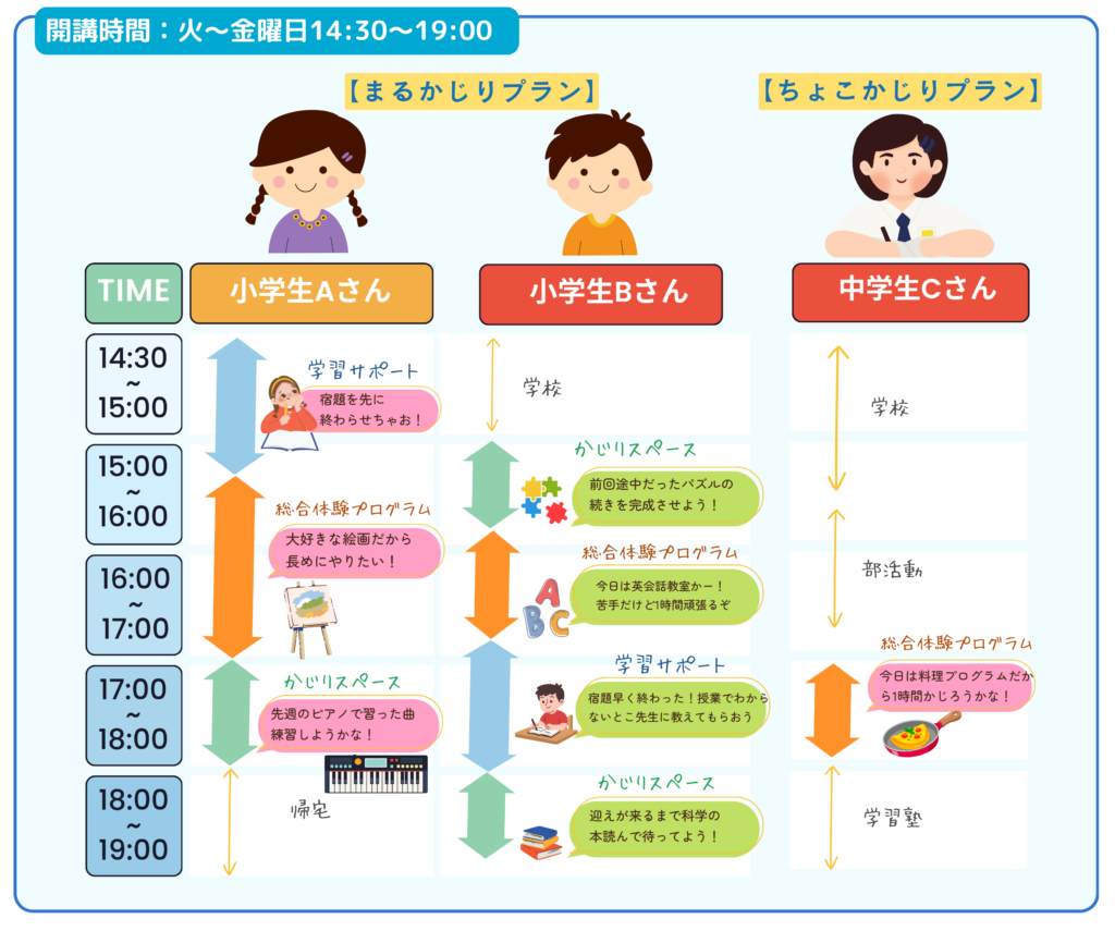 時間の区切りなく 「総合体験プログラム」「学習サポート」「かじりスペース」を組み合わせてお過ごしいただけます。